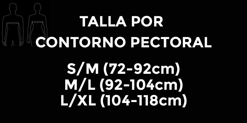 - Disponible en 3 tallas dependiendo el contorno de pecho: S/M (72-92cm), M/L (92-104cm), L/XL 104-118cm)