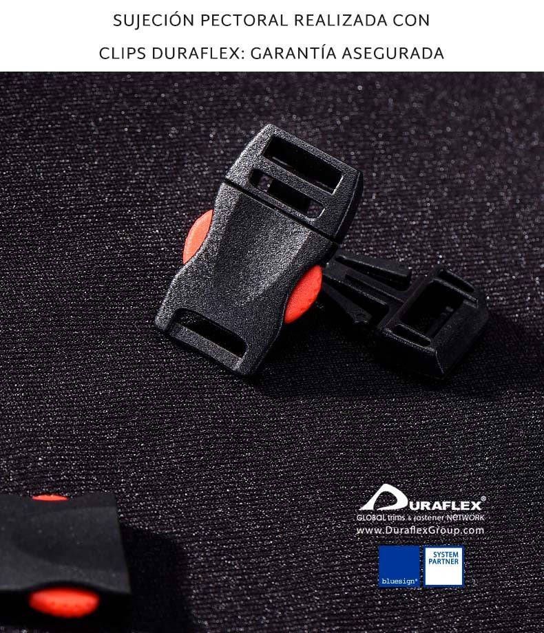 • Sistema de ajuste delantero personal ligero y sencillo que elimina puntos de presión en la zona del esternon y aumenta la comodidad para respirar. Hebillas Duraflex, para una garantia de anclaje. Con posibilidad de ajustar en 9 alturas diferentes, a gusto del usuario/a