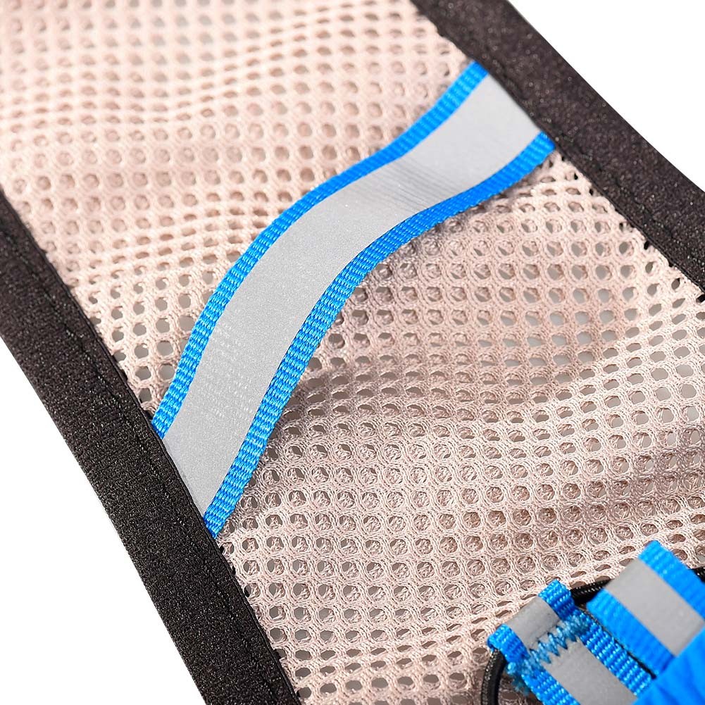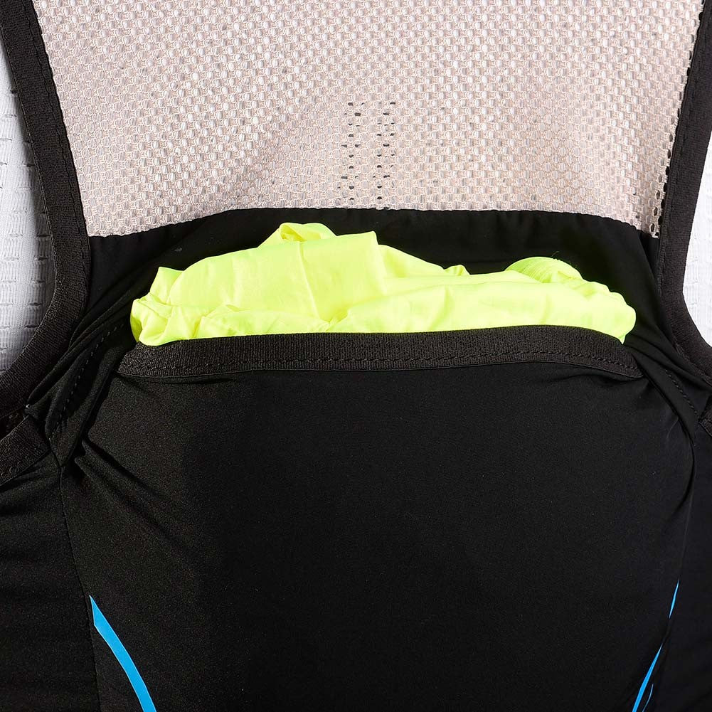 • Dos bolsillos delanteros de malla expandible con capacidad para dos soft flask de 500ml, y goma elastica con tirador reflectante para sujerar el soft flask doblemente, cierre bolsillo elástico y goma elástica