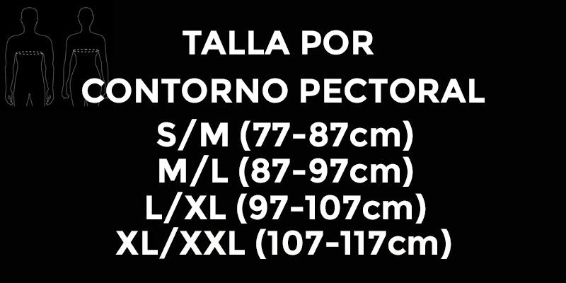 • Producto  en varias tallas, medidas según contorno de pecho: S/M (77-87cm); M/L (87-97cm) ; L/XL (97-107cm); XL/XXL (107-117cm). Se recomienda medir la máxima amplitud pectoral entre la línea mamaria y las axilas.
