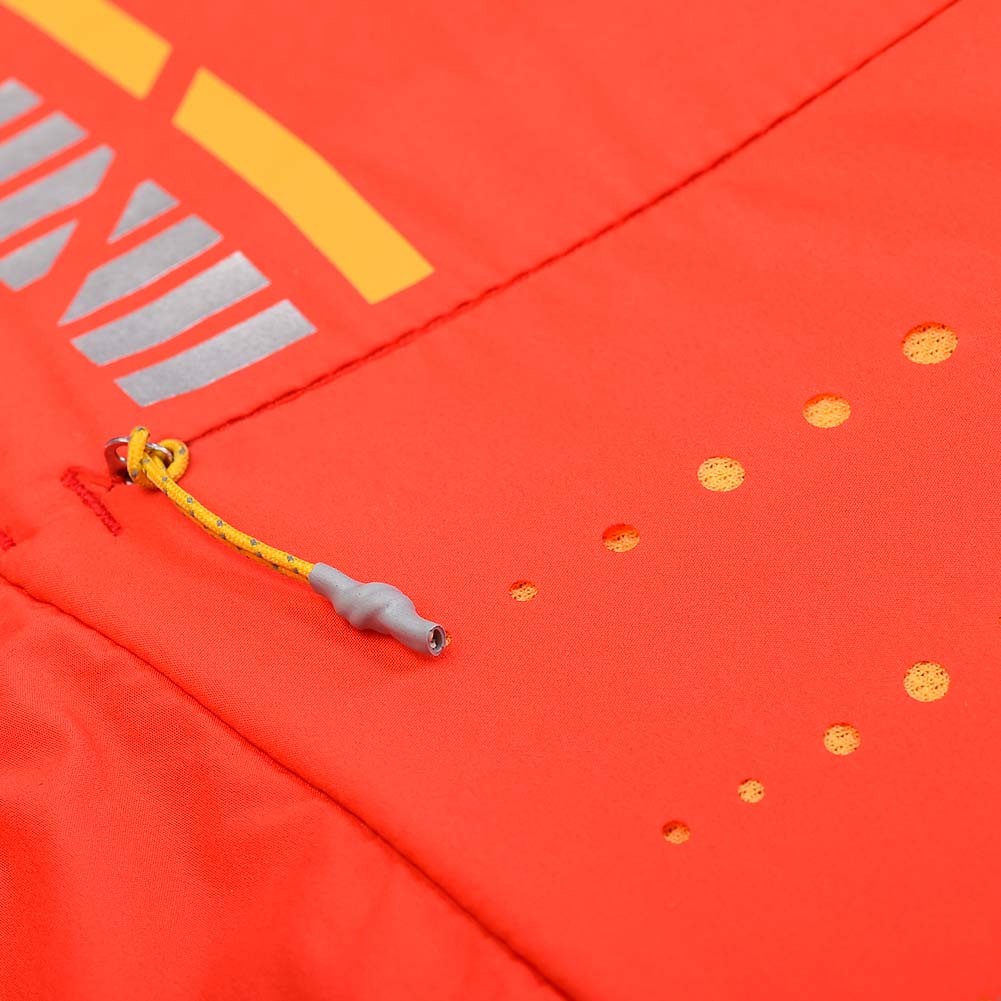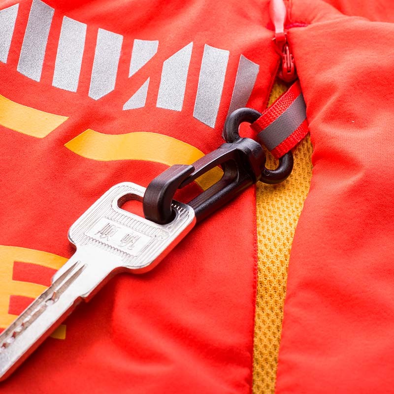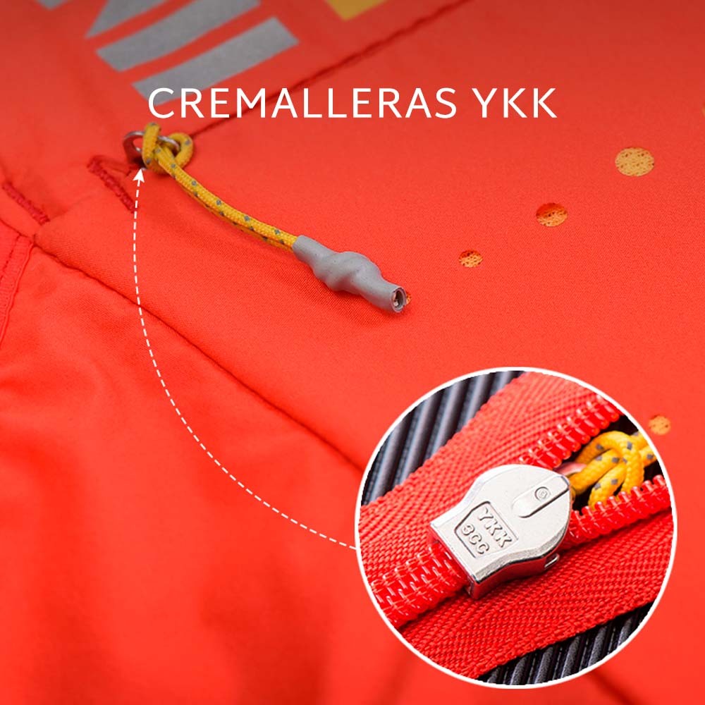 • Dos bolsillos delanteros de malla expandible con capacidad para dos soft flask de 500ml, y goma elastica con tirador reflectante para sujerar el soft flask doblemente, cierre bolsillo elástico y goma elástica