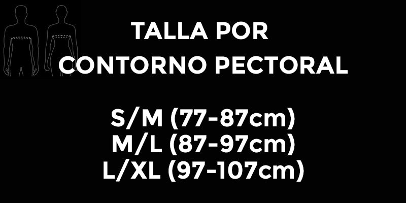 • Producto  en varias tallas, medidas según contorno de pecho: S/M (77-87cm); M/L (87-97cm) ; L/XL (97-107cm). Se recomienda medir la máxima amplitud pectoral entre la línea mamaria y las axilas.