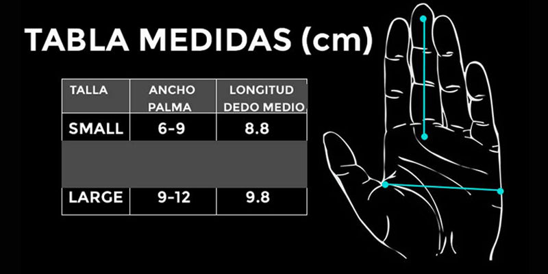 - Tallaje por ancho de mano: Small (Palma: 6-9 CM) ; Large (Palma: 9-12 CM)
